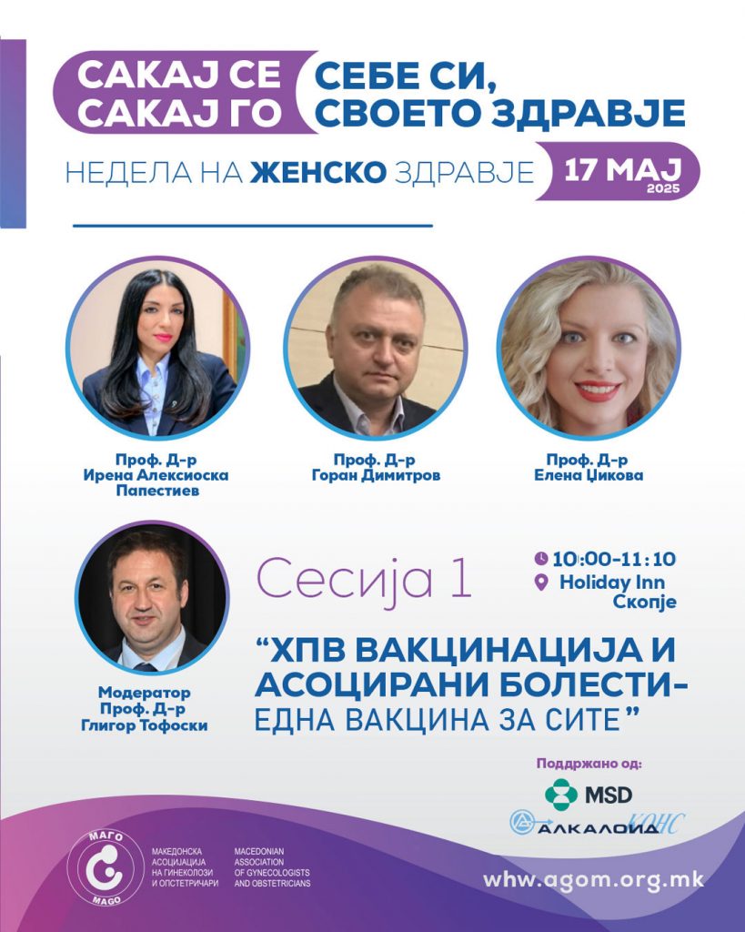 Чест ни е да Ве информираме дека во мај – посветена на Неделата на женското здравје на 17 мај во Холидеј Ин, Скопје ќе се одржи симпозиум под мотото „Сакаj се себе! Сакај го своето здравје“. Овој симпозиум е регистриран во Лекарска комора на РС Македонија и Македонско лекарско друштво со 11 поени.