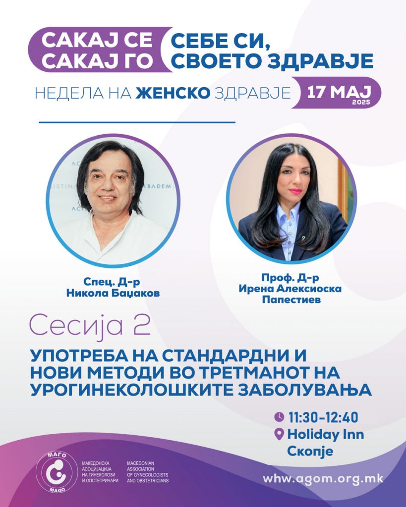 11:30- 12:40 “Сесија 2 Употреба на Урогинеколошки траки VS Ласерски и лапароскопски третман на урогинеколошки состојби”