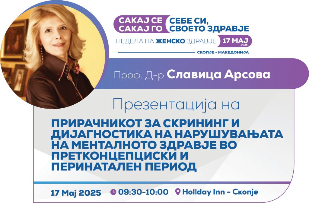 09:30-10:00 Презентација на Прирачникот за скрининг и дијагностика на нарушувањата на менталното здравје во претконцепциски и перинатален период – Проф. Д-р Славица Арсова